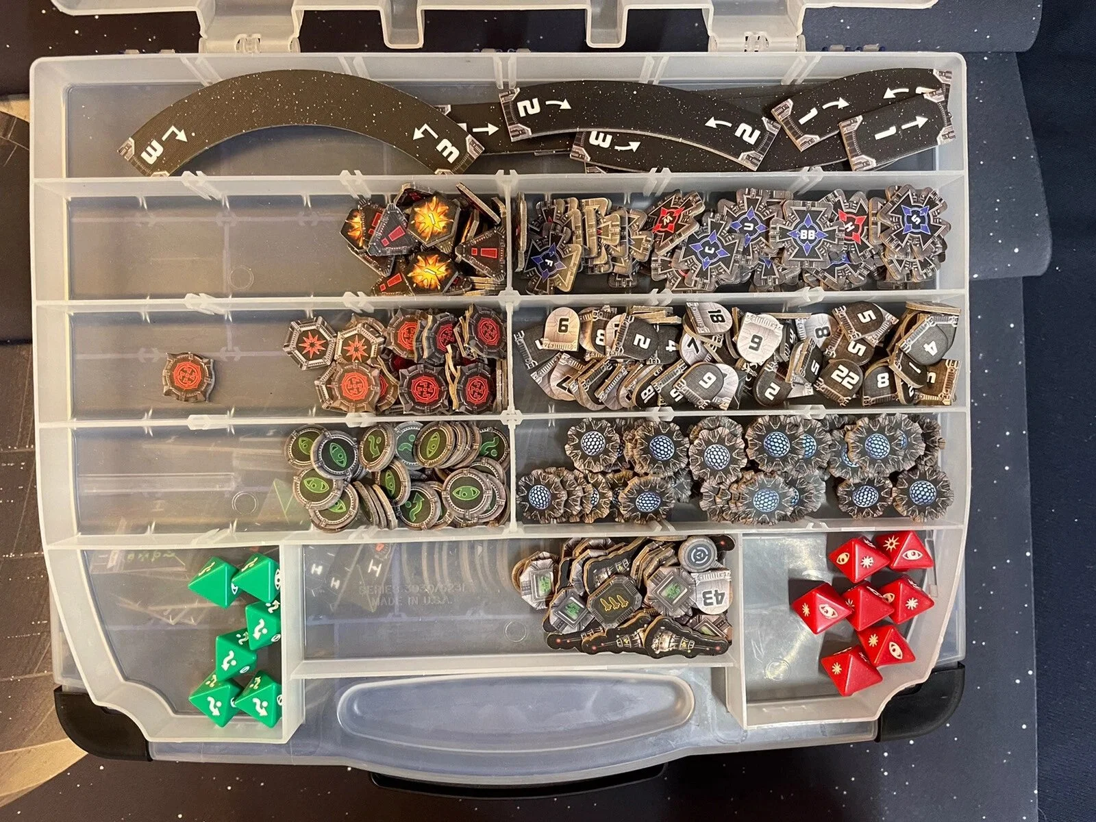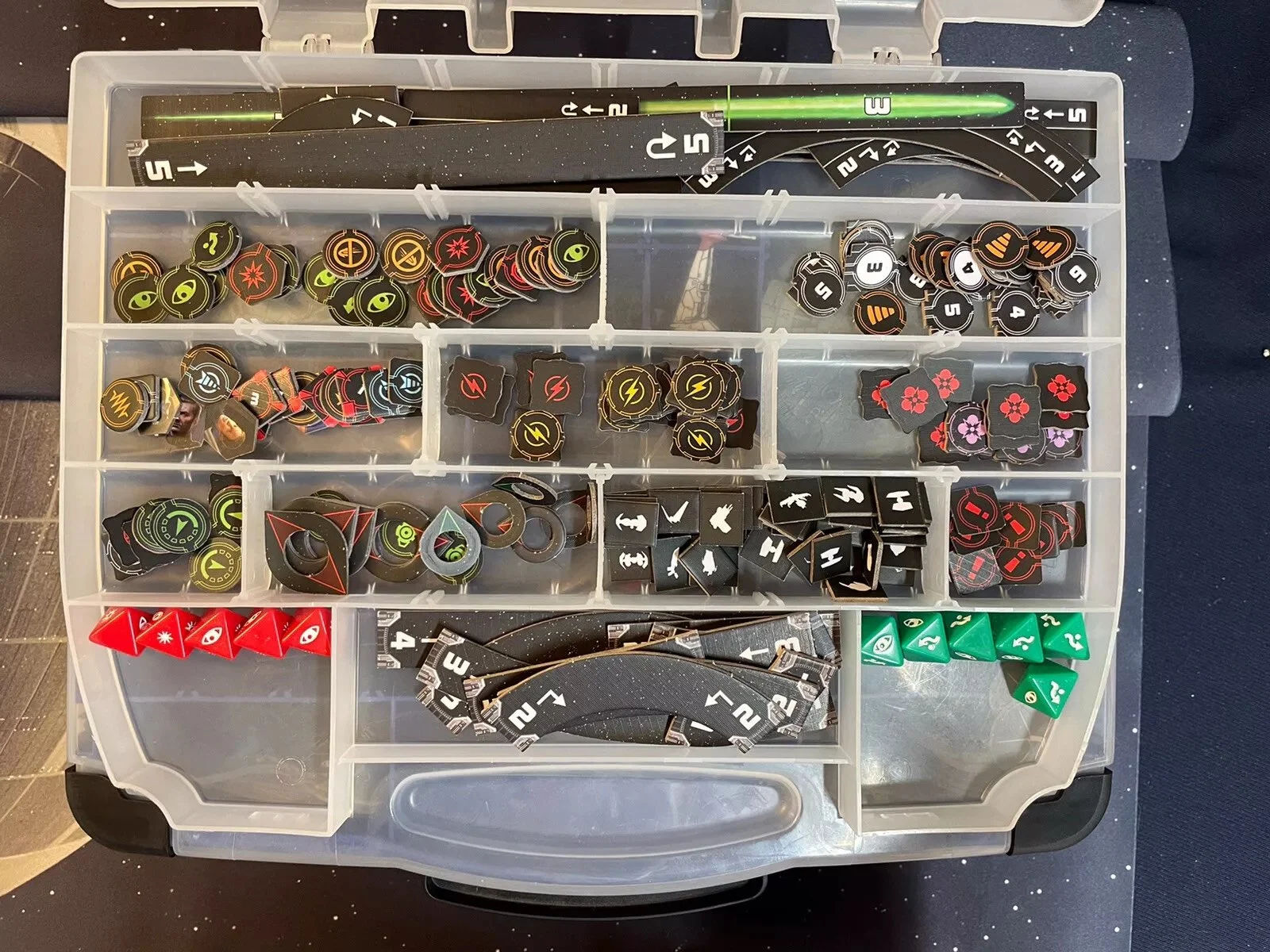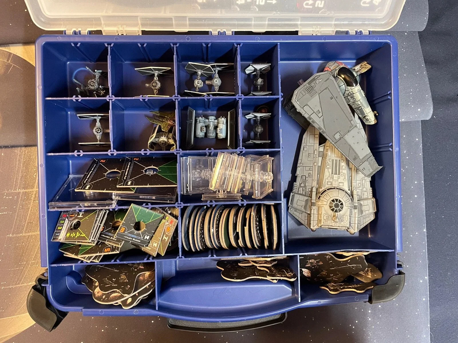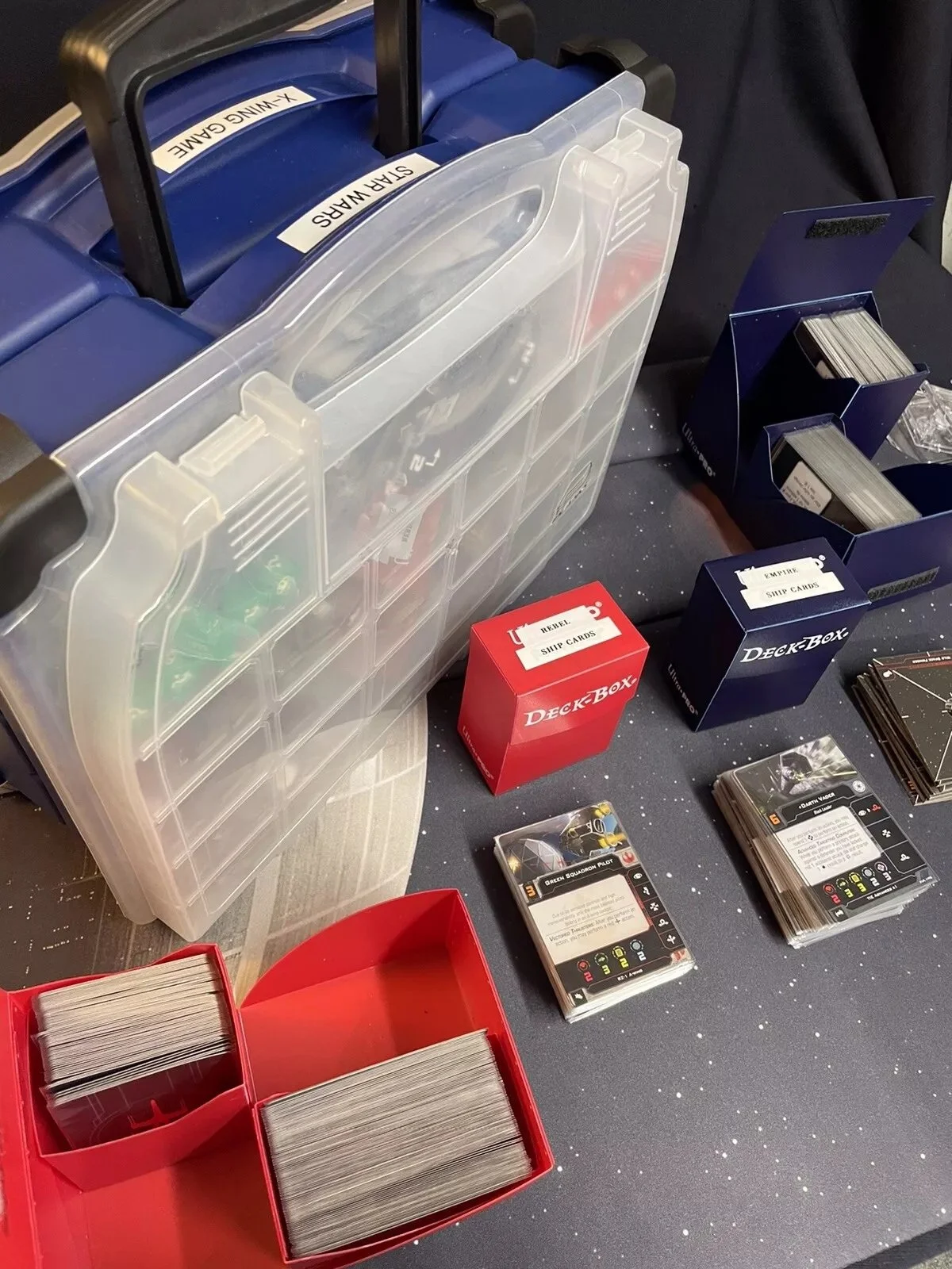 Star Wars X-Wing Minitures Game Lot + 36” X 36” Playmat. All pieces are included in the photos provided including the organizer case, card cases and playmat. Includes 1st edition extras - rules of play book & pieces + container.